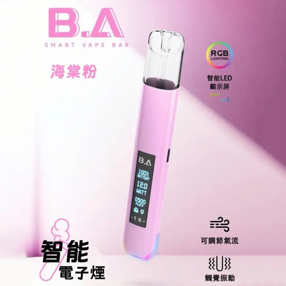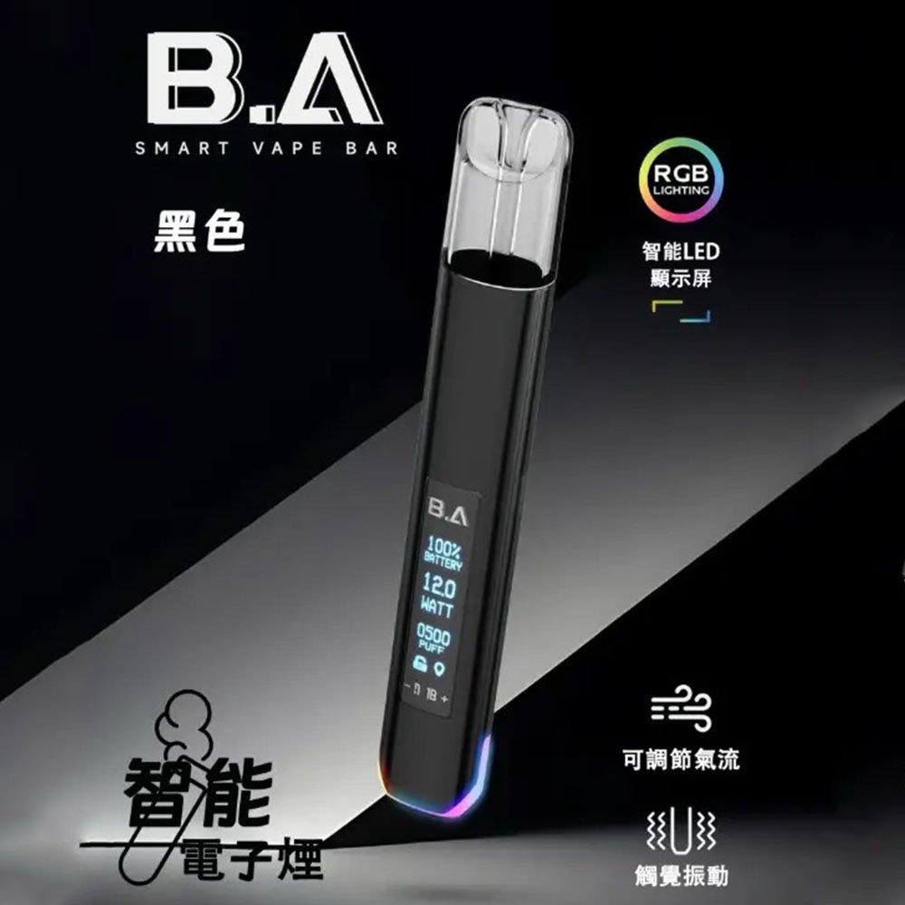 B.A Smart Vape Bar 主機特色介紹 B.A 主機將科技與美學完美結合,帶來前所未有的智能抽吸體驗: 智慧 LED 顯示螢幕 即時顯示 電量百分比、功率(Watt) 與 吸口數(Puff),資訊一目了然,掌控每一次使用。 RGB 炫彩燈效 底部智能燈光隨吸氣閃耀,夜間抽吸自帶氛圍燈,視覺與識別度雙雙拉滿。 可調氣流系統 側邊旋轉式氣流調節,自由切換 緊口肺吸 或 順暢直肺,滿足不同抽吸風格。 Haptic 震動回饋 每次操作或吸入皆有輕微震動提示,互動體驗滿分,科技感爆棚。 Type-C 快充系統 高速充電,約 40 分鐘充滿,更穩、更快、更安全。 一代通用設計:完美相容多款一代煙彈與注油空倉,推薦搭配 SP2S 煙彈,輕鬆升級你的小煙系統!
