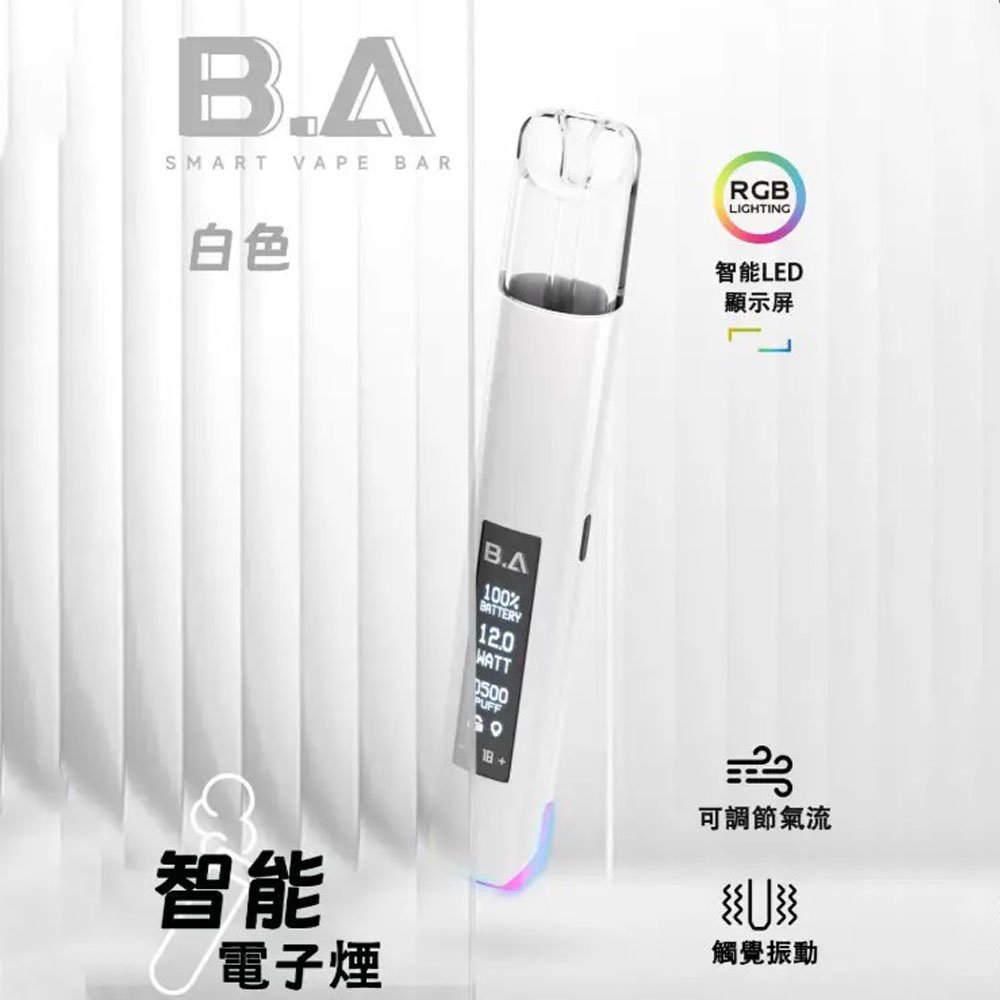 產品規格(Specification) 項目 詳細資訊 品名 B.A Smart Vape Bar 一代通用主機 顯示 Smart LED 螢幕 功率 可顯示至 20W 氣流 可調式設計 震動提示 支援 Haptic Vibration 充電介面 Type-C 兼容性 所有一代煙彈 / 空倉通用